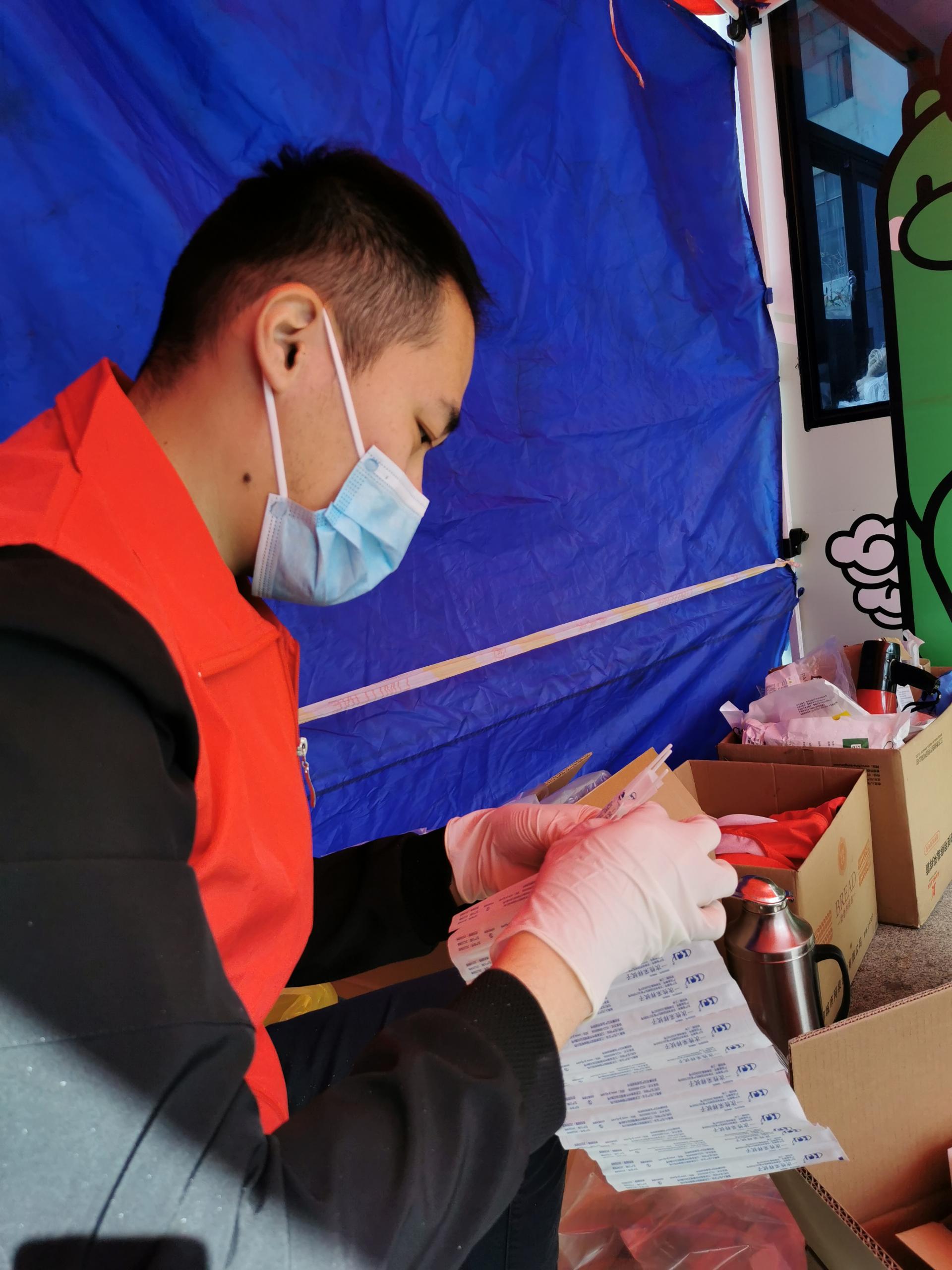 在薛家島街道青云山路社區(qū)服務(wù)的黨員孫建強(qiáng),沖在一線、干在一線,協(xié)助社區(qū)開展核酸檢測工作。據(jù)孫建強(qiáng)介紹,他負(fù)責(zé)一次性檢測棒的拆裝工作,拆開檢測棒,交給采樣工作人員。一邊拆,一邊監(jiān)測,流水線作業(yè),提高檢測效率。這樣一項(xiàng)看上去很簡單的工作,孫建強(qiáng)一做就是兩三個(gè)小時(shí)。